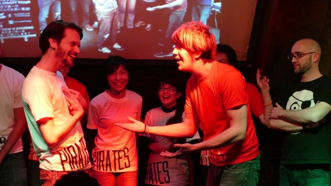即興コントと聞いて、どんな物を想像するだろうか?恐らくピンと来ない方が多いと思う。役者がその場でお客様にお題をもらって、即興でコメディを演ずる形式の舞台である。演劇のメソッドを学んだ事がある方なら、エチュードという名の方がわかりやすいかも知れない。場面や人物の性格だけを設定し、台本なしで、アドリブで作る即興劇だ。この即興劇に笑いの要素を取り入れ、しかもバイリンガルで演じているのがパイレーツ・オブ・東京湾だ。メンバーのほとんどは英語圏出身だが、わずか5名の日本人メンバーと共に、日英バイリンガルで即興コントを作り上げる。月に一回、恵比寿のブリティッシュパブWhat the Dickensで行われるライブは、開演前になると観客で一杯になり、期待に満ちた高揚感で場が満たされる。